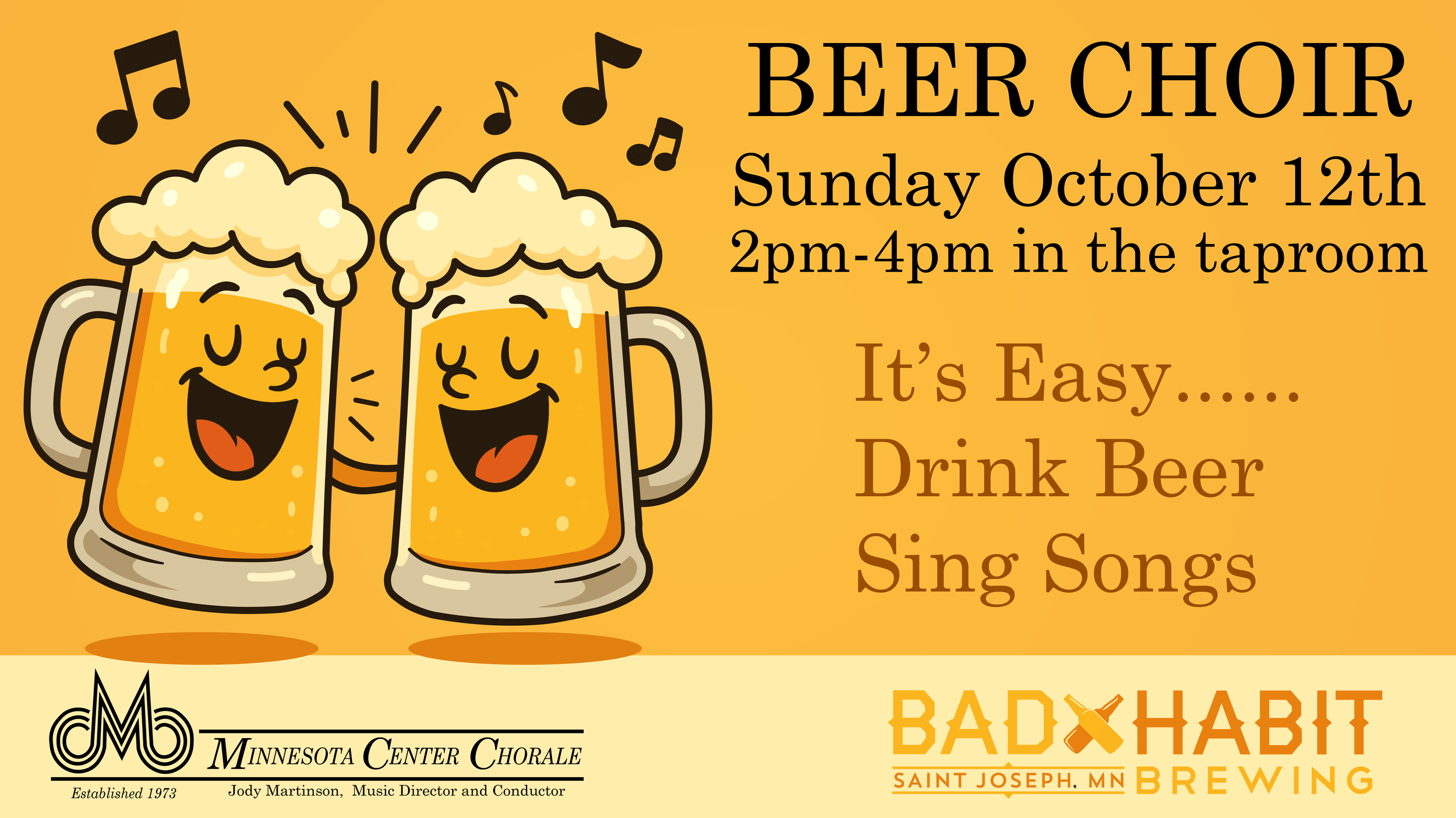 Back to All Events Beer Choir Sunday, October 12, 2025 2:00 PM 4:00 PM Bad Habit Brewing Company 25 College Avenue North Saint Joseph, MN, 56374 United States (map) Google Calendar ICS