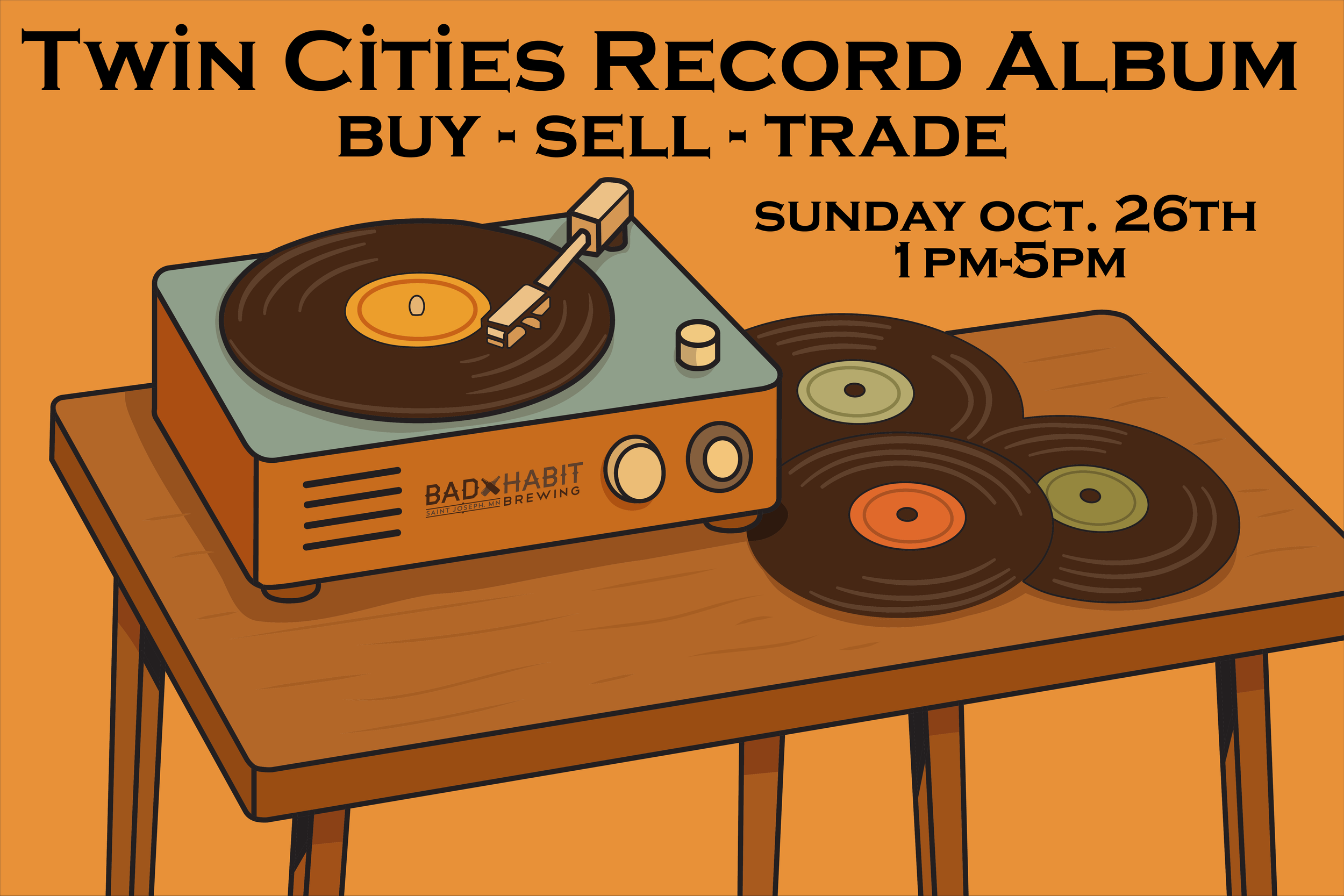 Twin Cities Record Album Event Sunday, October 26, 2025 1:00 PM 5:00 PM Bad Habit Brewing Company 25 College Avenue North Saint Joseph, MN, 56374 United States (map) Google Calendar ICS 🎶💿 The Twin Cities Record Album Group is back! Join us for an afternoon of buying, selling, and trading vinyl on Saturday, October 26th in the warehouse from 1pm–5pm. Dig through the crates, find some gems, and enjoy a beer while you browse. 🍺✨#joetownmn #BadHabitBrewing #VinylSwap #RecordCollectors #BuySellTrade #JoetownEvents #CraftBeerAndVinyl
