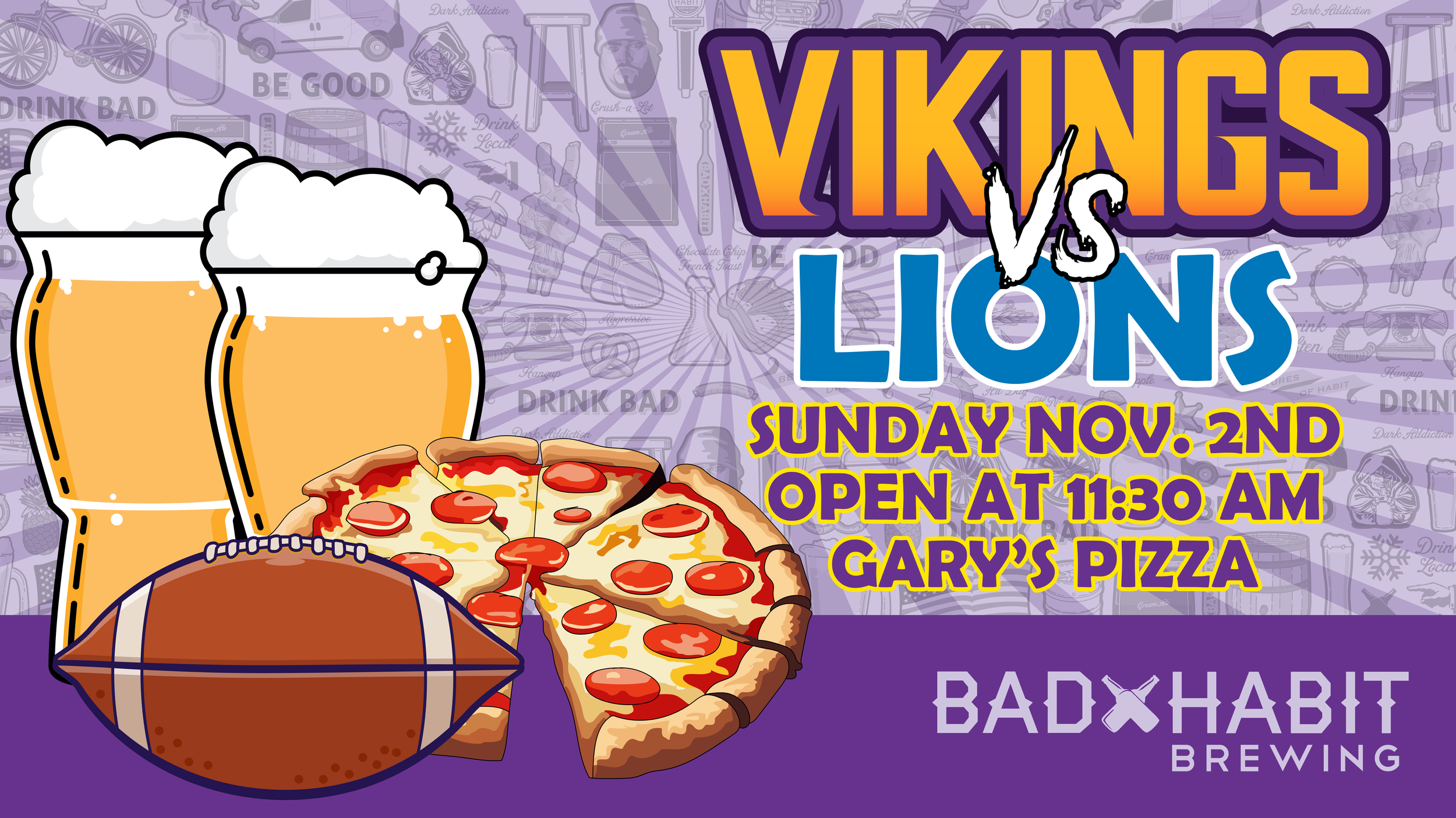 Back to All Events MN Vikings vs Lions Sunday, November 2, 2025 12:00 PM 3:30 PM Bad Habit Brewing Company 25 College Avenue North Saint Joseph, MN, 56374 United States (map) Google Calendar ICS