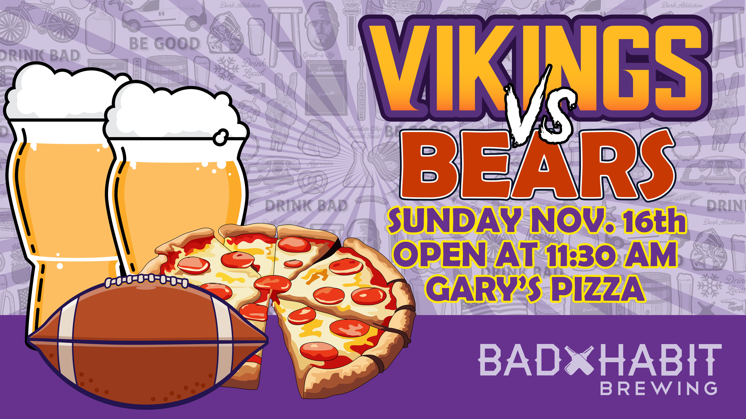 MN Vikings vs Bears Sunday, November 16, 2025 12:00 PM 3:30 PM Bad Habit Brewing Company 25 College Avenue North Saint Joseph, MN, 56374 United States (map) Google Calendar ICS
