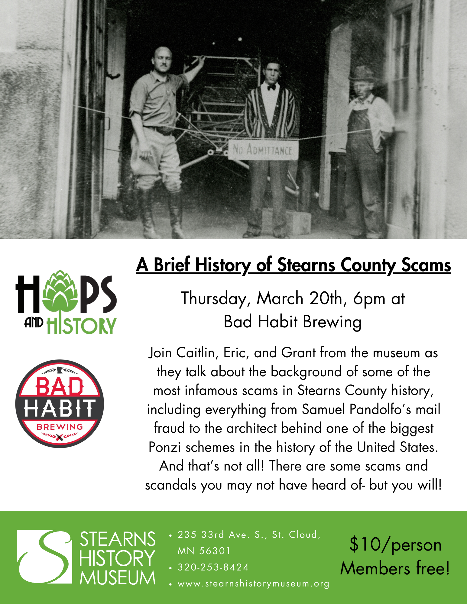 Back to All Events Hops and History with Stearns History Museum Thursday, March 20, 2025 6:00 PM 8:00 PM Bad Habit Brewing Company 25 College Avenue North Saint Joseph, MN, 56374 United States (map) Google Calendar ICS