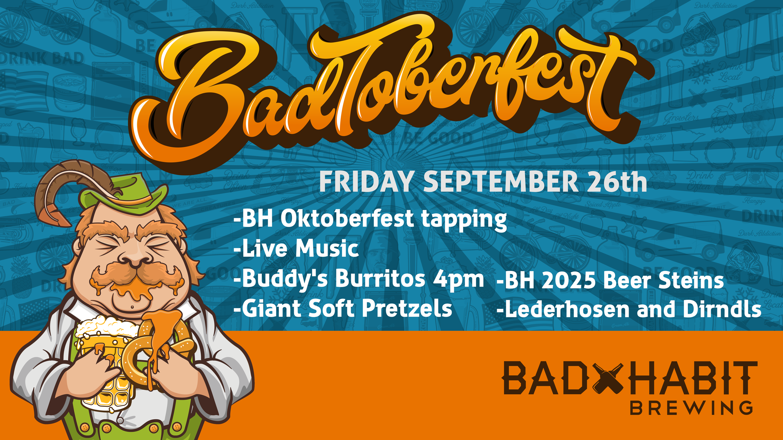 Back to All Events Badtoberfest 2025 Friday, September 26, 2025 2:00 PM 10:00 PM Bad Habit Brewing Company 25 College Avenue North Saint Joseph, MN, 56374 United States (map) Google Calendar ICS